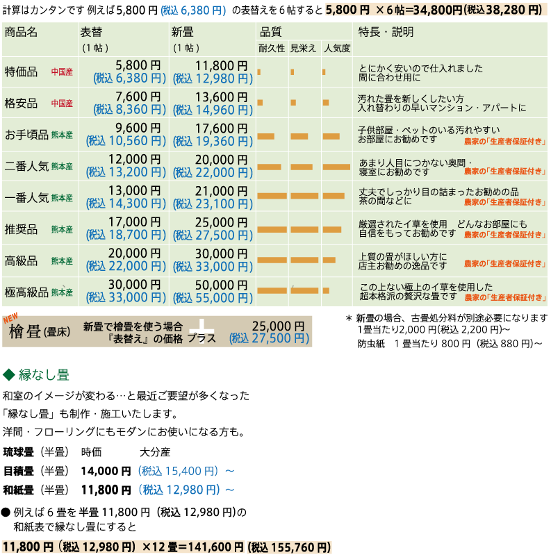 畳表を替える表替え・新畳(畳床+畳表+畳縁)共、